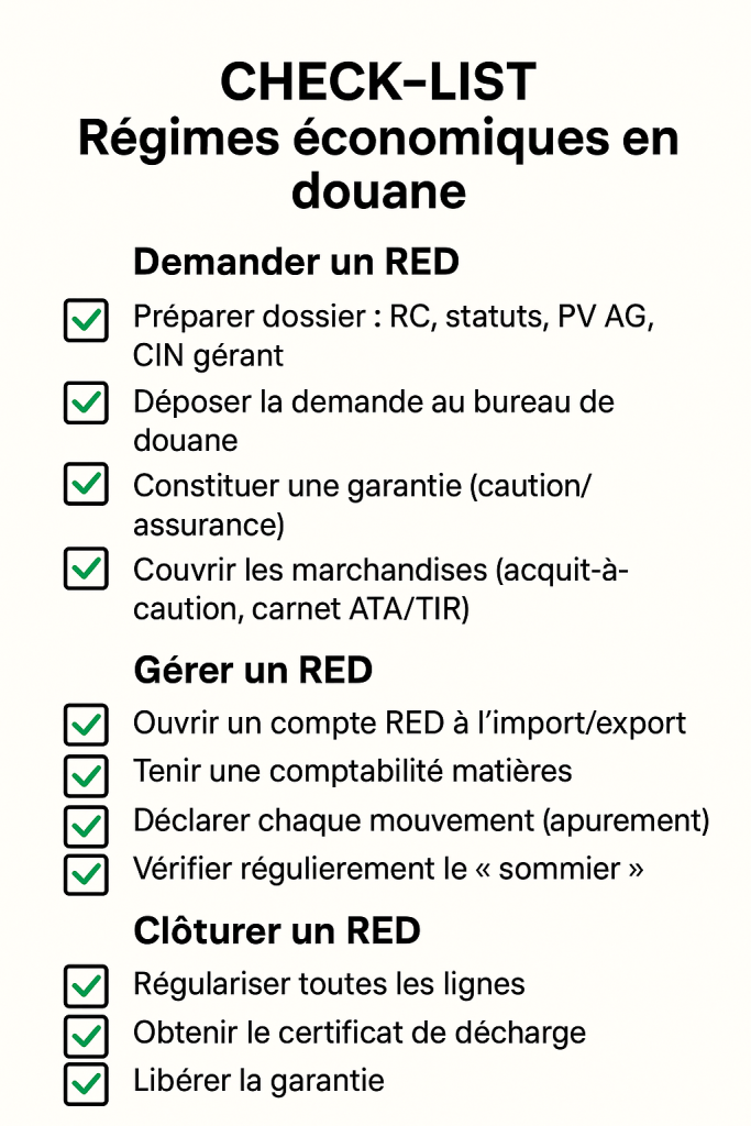 👉 Exemple pratique : Une société basée à Tanger peut facilement utiliser les RED via le port de Tanger Med, qui est un hub majeur pour ces opérations.